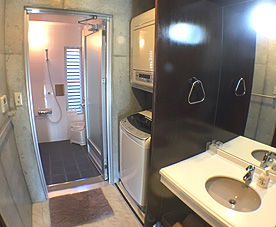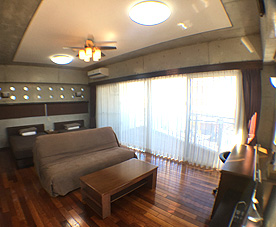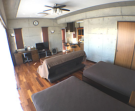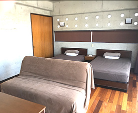 | セミダブルベッドを2台とソファーベッド1台を設置しております。セミダブルベッドを合わせての御利用も可能です。 バルコニーはウッドデッキ仕様とし、台風でも飛ばされないコンクリート製のベンチを設置しております。 喫煙は、バルコニーのみで可能です。 |
